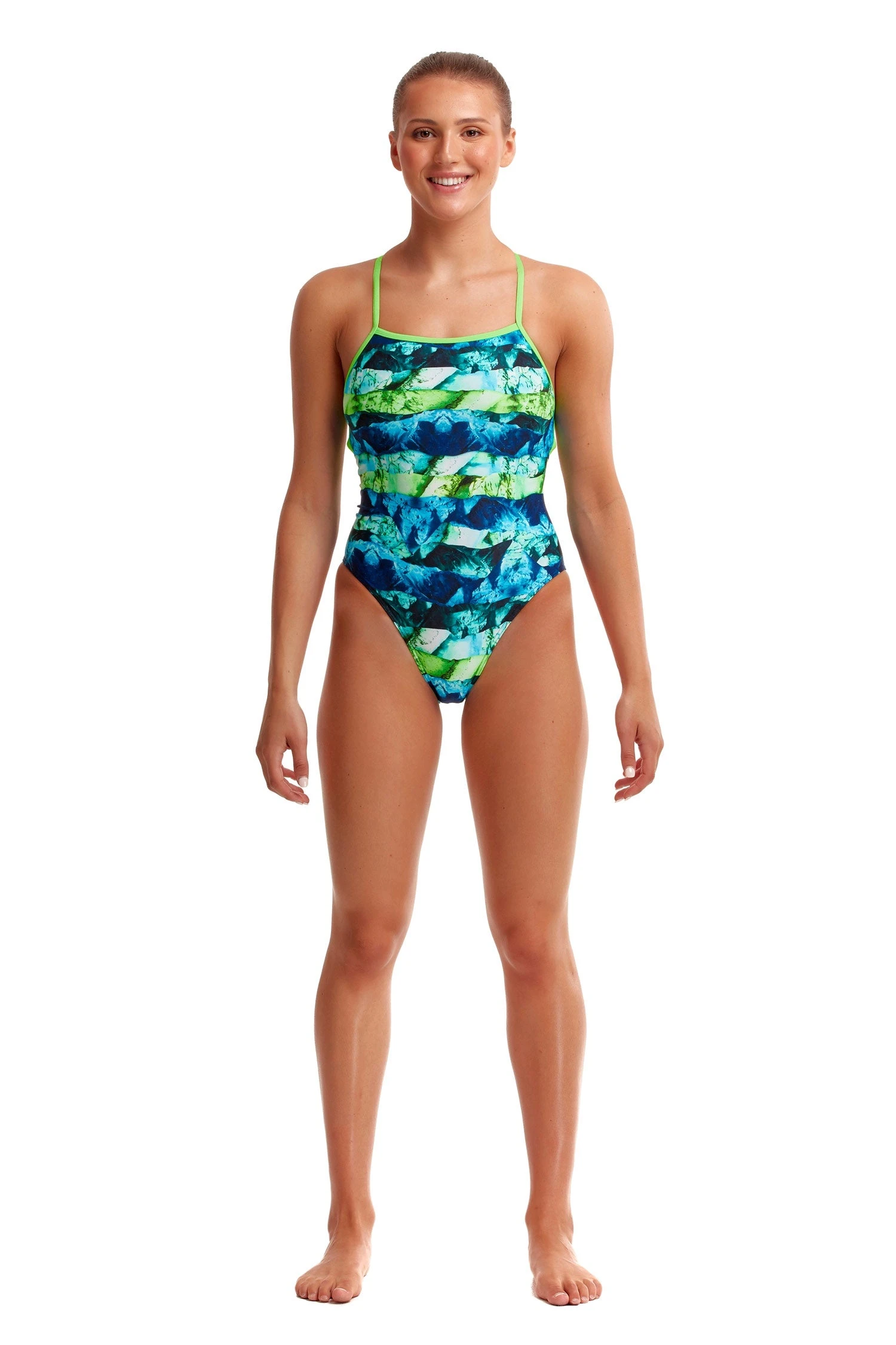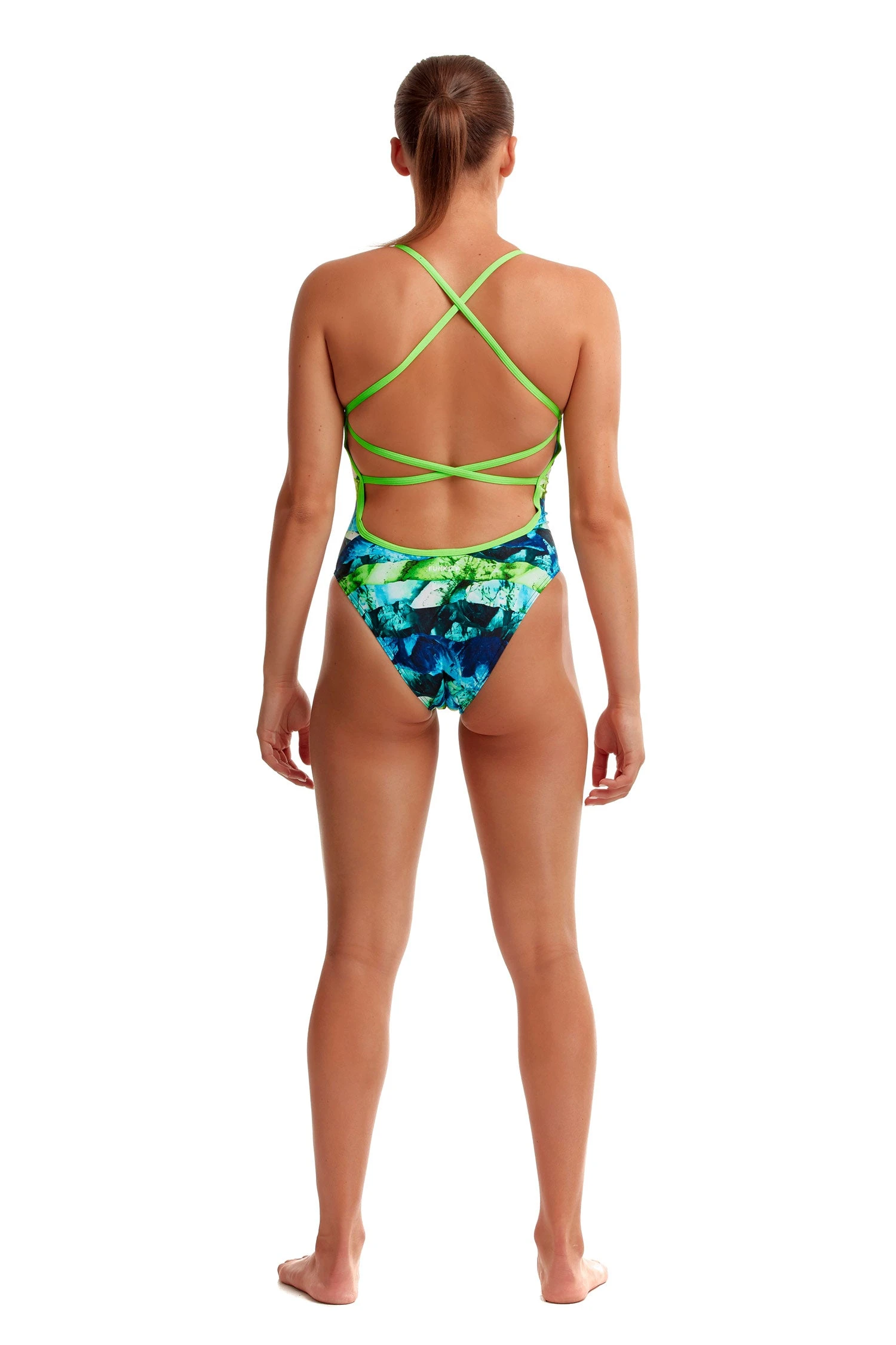 You’ll be sure to get noticed on pool deck in Funkita’s strappiest one piece yet! Single strap binds that criss cross down your back with a moderately high cut leg and full front lining.