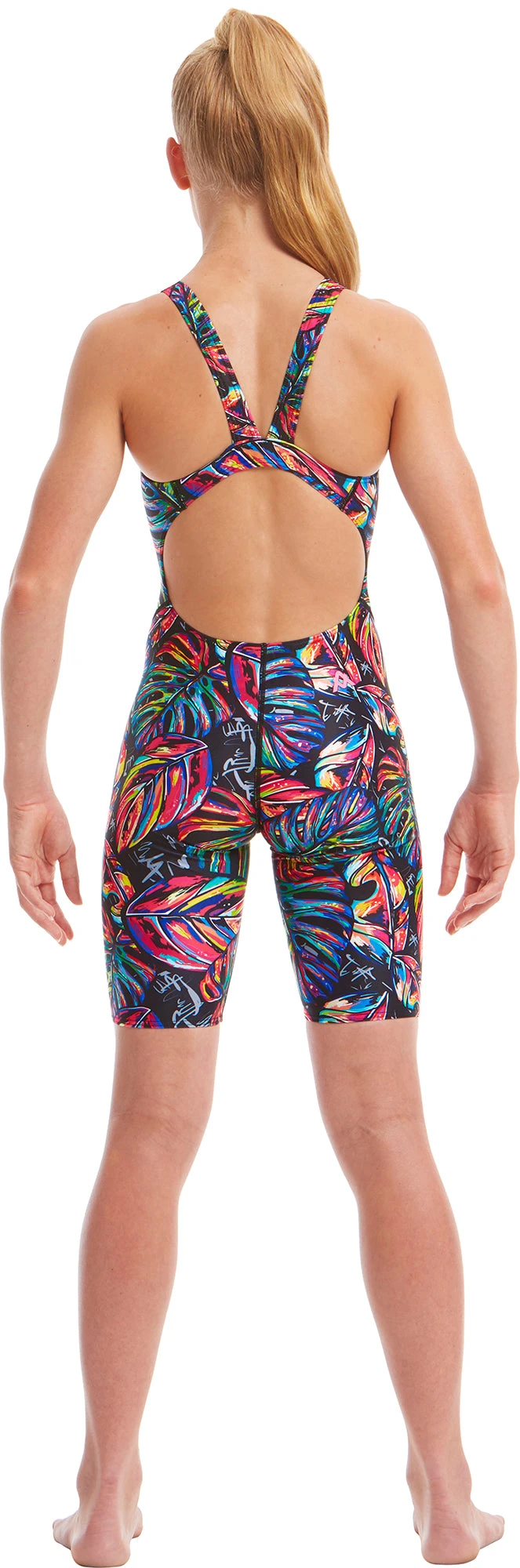 Got a Caribbean soul you can barely control? Sounds like you were born to cruise in the Tropical Twilight Kneelength. Alive with tropical sun rays, this sweet style features feathery palm fronds streaked with neon oranges and blues. Live forever on Island time in this exotic Kneelength.